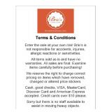 Enter the sale at your own risk! Brie’s is not responsible for illnesses, accidents, injuries, allergic reactions or sensitivities of any kind. All items are sold as is and have no warranties. All sales are final. Examine items carefully before purchasing! We reserve the right to charge correct pricing on items which have removed, changed or altered price stickers. Cash, good checks, VISA, MasterCard, Discover Card and American Express accepted. Credit cards over $10 please.
