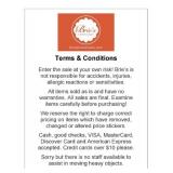 Enter the sale at your own risk! Brie’s is not responsible for illnesses, accidents, injuries, allergic reactions or sensitivities of any kind. All items are sold as is and have no warranties. All sales are final. Examine items carefully before purchasing! We reserve the right to charge correct pricing on items which have removed, changed or altered price stickers. Cash, good checks, VISA, MasterCard, Discover Card and American Express accepted. Credit cards over $10 please.