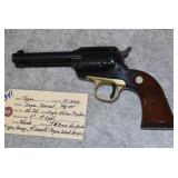 1. Colt – Mod. Single Action Army – Early 2nd Generation – 45 Long Colt Cal. Single Action Revolver – w/7 ½” Barrel – Blued/Case Hardened Finishes – w/Rampant Colt Checkered Grips– w/Very Faint Cyl. Line – Mfg. in 1956 – Serial #5767SA – Appears Unfired w/Matching Serial # Lift Lid Black Box, Manual, Warranty Card & Handling Guide – A Great Find Being a High Condition 1st Year Production, 2nd Generation Gun