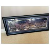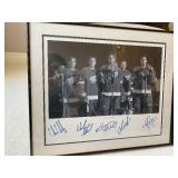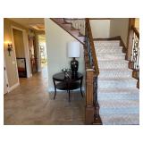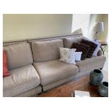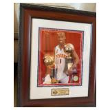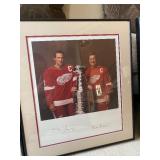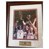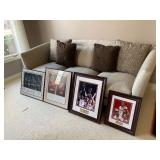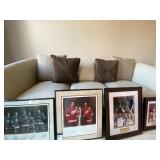 Entrance: Baker Furniture sofa, Baker Furniture entryway table, framed art prints, signed Detroit red wings photos, Detroit pistons Ben Wallace and Chauncey Billups framed photos