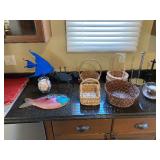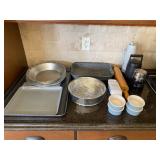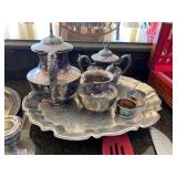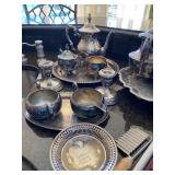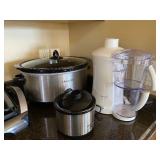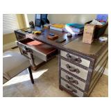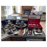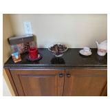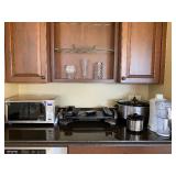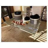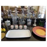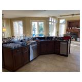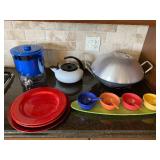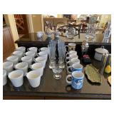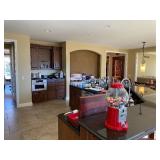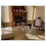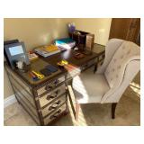 Kitchen: Crate and Barrel white mugs, pint glasses, DeLonghi toaster oven, griddle, crock pots, Krups optifruit juicer, chafing dish, leather seat bar stools, Hooker Furniture leather top desk, wok, pots and pans, bakeware, pottery barn serving tray, teapot, gum all machine, silver plated flat ware set, silver plated serving set, various glass vases, water pitchers, ceramic plates tufted arm chair, glass top coffee table, Hooker Furniture dining room table, Ethan Allen ottoman, office supplies, picture frames