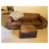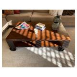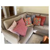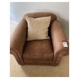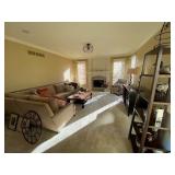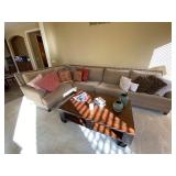 Living Room: Norwalk Furniture sectional, rustic looking coffee table, entertainment center, Hummel ornaments, wood decoy duck, display shelf, lamps, arm chair