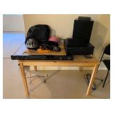 Basement: Shakespeare ugly stick Shakespeare synergy Shakespeare spectrum fishing poles, Dyson vacuum, rug doctor, Hoover floor mate, shop Vacuum, rio adventure beach chairs, red wagon, Coleman cooler, shoe rack, sofa and ottoman, glass top square table, wood rocking chair, folding chairs, spirit flex step workout system, Panasonic tv, entertainment center, Samsung sound bar, ski helmet and goggles, music chair and stand, rugs