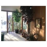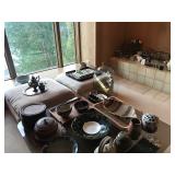Family Room: Couches, and tables, fake plants, baskets, brass Oriental pot, telescope, baby grand piano, vases, candle sticks, wall art, Asian inspired wall art, pottery, China, espresso classes, or nay umbrella, books, records, 45s, Sumi brush set