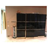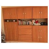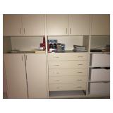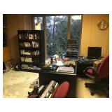 Office: Corner desk, desk chair, filing cabinets, books, sharp audio equipment, television, cereals, magazines