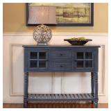 Décor Therapy Accent Table, Antique Navy Traditional design and timeless character are the building blocks upon which the Morgan Console Table was designed. The quintessential transitional table that blends classic styling, modern updates, versatility and function. Two drawers provide an out of sight storage place for unsightly clutter. Stylishly house belongings in the two cabinets, each featuring a glass window frame door that adds charm to your living space. A slatted shelf expands your storage capability. A versatile piece that can be used as an entryway table, living room accent table or in a dining room as a buffet server. Measures 42x14x34.25 Constructed of wood. This item is DAMAGED - HOLE IN BACK - SEE 2ND PHOTO. Please come Preview! No Refunds. Thanks. LARGE ITEMS MUST BE PICKED UP ON THE SCHEDULED NIGHT OF PICKUP. WE WILL NOT HOLD THEM. NO EXCEPTIONS. MSRP: $ 214 |