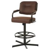 Impacterra Haverfordwest Tilt-Swivel Stool, 26" Counter Height The Funhouse collection is a series of game-oriented traditional dining and bar pieces spanning poker tables, caster chairs and extendable dining tables. Caster chairs, dining tables and bar stools are housed in wood and metal frames, while the poker tables are all wood save for the felt gaming surfaces. Metal surfaces are powder coated in a bronze-colored Accent Burnished finish and wood grain surfaces are finished in in medium-brown Windsor. Dining chairs use 4-legged casters while stools use 5-legged pedestals, and both feature tilt-swivel capability. Stools feature metal ring footrests, swivel 360 degrees and are available in 30" bar or 26" counter height seats. This counter-height Haverfordwest swivel stool has fabric-padded arms and is upholstered in a brown synth-leather. This item is NEW. Please come Preview! No Refunds After Item Has left the Building. Verify the condition of your Item before you leave, Thanks. LARGE ITEMS MUST BE PICKED UP ON THE SCHEDULED NIGHT OF PICKUP. WE WILL NOT HOLD THEM. NO EXCEPTIONS. MSRP: $ 177 |