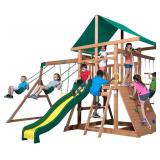 Backyard Discovery Mount McKinley All Cedar Wood Swing Set The Mount Mckinley wooden swing set by Backyard Discovery is made of 100% Cedar wood and is pre-cut, pre-drilled, and pre-stained to create an easier assembly experience. Perfectly constructed for all aspiring climbers, this outdoor cedar swing set offers loads of fun in a compact footprint that is perfect for any size yard. With 3 unique climbing features including the full width, double rock wall with climbing rope and 9 climbing rocks, 6. 5 ft. Rope ladder and easy-to-climb flat step ladder, kids of all abilities will be able to safely test their climbing skills. The large, Breezy upper fort can cater to several children with a 16 sq. Ft. wooden deck that includes a high-performance steering wheel and a pretend telescope. The evenly spaced picketed walls allow for cool, Breezy playtime while giving parents A clear line of sight to the fun. Backyard Discovery has included All the standard features you want in an outdoor playset with an 8 Ft. wave slide and 3 position swing beam complete with 2-26 inch heavy, duty belt swings and a suspended, trapeze bar. The open-air lower fort gives you the option to create a personal sandbox. Made with 100% Cedar wood, The Mount Mckinley wooden playset not only offers unique play features but it looks great too. This item is OPEN BOX - COMPLETE - 2 BOXES. Please come Preview! No Refunds. Thanks. LARGE ITEMS MUST BE PICKED UP ON THE SCHEDULED NIGHT OF PICKUP. WE WILL NOT HOLD THEM. NO EXCEPTIONS. MSRP: $ 894 |