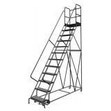 Tri-Arc KDSR112246-D2 12-Step 20" Deep Top Steel Rolling Industrial & Warehouse Ladder with Handrails, 24" Wide Perforated Tread Tri-Arc’s Deep Top Steel Rolling Ladder model is the “big top” alternative to the Rolling Industrial & Warehouse Ladder. It's 20” deep top platform offers a spacious area to perform prolonged work from safely and comfortably. Choose from either perforated or grip-strut tread designs based on the environment in which the work will be performed. All of the models are equipped with hand rails and guardrails to provide the safety and comfort when ascending, descending and performing work from the ladder. Tri-Arc’s Deep Top Rolling Ladder model is engineered and manufactured in compliance with OSHA 1910.29 and ANSI A14.7 standards. Additional features include gray powder coated paint finish, 24” wide steps, positive locking system engages when the user step on the first step with a pedal release. Rated capacity of 450 lbs. and made in the USA. This item is OUT OF BOX - DAMAGE - SEE ADDITIONAL PHOTOS. Please come Preview! No Refunds. Thanks. LARGE ITEMS MUST BE PICKED UP ON THE SCHEDULED NIGHT OF PICKUP. WE WILL NOT HOLD THEM. NO EXCEPTIONS. MSRP: $ 755 |