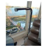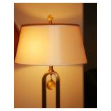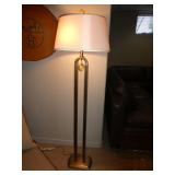 - Baker “Syro” brushed brass floor lamp w/ Murano gilt glass pendant, designed by Laura Kirar