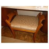 - William Switzer burled round table with drawer & Pair of carved Biedermeier-style benches w/ calf hide upholstery & X bases