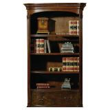 One adjustable wood framed glass shelf. Old World Walnut Burl finish. One adjustable wood glass shelf. Two fixed shelves. Illuminated bookcase. One file drawer with metal slides for letter or legal files. Case levelers. Select solids, burl and flat cut walnut veneers. Width 50" (127 cm) Depth 22" (56 cm) Height 84" (213 cm)