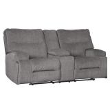 Ashley Coombs Reclining Loveseat with Console 4530294 Tab pull reclining motion Corner-blocked frame with metal reinforced seat Attached cushions High-resiliency foam cushions wrapped in thick poly fiber Storage console with 2 cup holders Polyester upholstery NEW! MSRP: $749 No refunds after the item has left the building. |