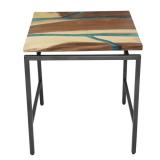 Elrond End Table BY Hopper Studio The Elrond end table is a stunning example of how mixing materials can create a beautiful combination. This table boasts a solid Acacia wood top, with a contrasting teal resin abstract pattern throughout. Paired with a gunmetal base, the mixed material appeal is striking and versatile. This item is NEW Please come Preview! No Refunds After Item Has left the Building. Verify the condition of your Item before you leave, Thanks. MSRP: $194