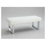 Chintaly White White Pu Long Bench - Chrome LINDEN-BCH-WHT Bring contemporary style to your space with this upholstered bench. Enveloped in easy-to-clean white faux leather upholstery, the bench seat strikes a thick rectangular silhouette. Detail stitching lends a tailored touch, while thick foam padding provides added comfort and support. Rounding out the design, the sled base includes two clean-lined metal rectangular legs in a gleaming chrome finish. Dimension: 48.23W x 17.32D x 18.7H This item is NEW Please come Preview! No Refunds After Item Has left the Building. Verify the condition of your Item before you leave, Thanks. MSRP: $340