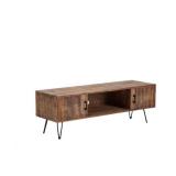 Middleton 60 in. Natural Wood TV Stand Fits TVs Up to 65 in. with Storage Doors by Crawford & Burke Middleton Media TV Stand is constructed of reclaimed fir with metal accents. Natural finished reclaimed fir adds history and time worn character, while black iron hairpin legs add an industrial component. The sturdy hairpin legs fold to allow for easy portability. Each tabletop is lacquer finished for long lasting protection and durability. Other features include cable access, doors that open to storage and storage shelf. This TV stand will accommodate most 65 in. flat screen TV's. Size: 60 in. W x 18 in. D x 20 in. H. This item is NEW Please come Preview! No Refunds After Item Has left the Building. Verify the condition of your Item before you leave, Thanks. MSRP: $ 357