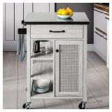 Anibar Kitchen Cart WHITE Please note that the actual color of the item is white, not gray like pictured. The kitchen cart offers so much in the way of storage and organization. A spacious drawer, adjustable cabinet area covered by a hollow-carved designed door and open shelves provide ample storage space for supplies and gadgets. Its stainless steel countertop lets you chop veggies and roll pizza dough with ease. A side towel bar provides convenience for you to wipe your hands when cooking. Durable locking casters allow you to easily move the piece wherever it is needed most and to make the cart stands firmly there. 35.8'' H x 25.6'' W x 18.9'' D This item is NEW Please come Preview! No Refunds After Item Has left the Building. Verify the condition of your Item before you leave, Thanks. MSRP: $ 180