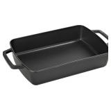 Staub Cast Iron 15-inch x 10-inch Roasting Pan - Matte Black Made in France Oven Safe up to 500F Smooth enamel bottom works on all stovetops Each piece is one of a kind Rough texture results in exceptional browning This item is NEW Please come Preview! No Refunds After Item Has left the Building. Verify the condition of your Item before you leave, Thanks. MSRP: $ 255