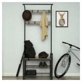 Odysseus Hall Tree with Bench and Shoe Storage Whether it is clothes, scarves, shoes, or handbags, this hall tree is ready to serve; the shoe rack can hold more shoes; the top of the shoe bench board with a load capacity can be used to store handbags or storage boxes This item is NEW Please come Preview! No Refunds After Item Has left the Building. Verify the condition of your Item before you leave, Thanks. MSRP: $ 72