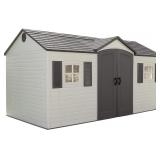 Lifetime 6446 Outdoor Storage Shed with Shutters, Windows, and Skylights, 8 by 15 Feet, Putty/Brown Features- 6 small skylights, 2 shatterproof polycarbonate windows, 2 screened vents, 2 decorative shutters, 2 peg strips, 2 90" x 9" shelves, 4 corner shelves. Exterior Dimensions: 15 ft. W x 8 ft. D x 7 ft. 10.8 in. H Interior Dimensions- 90" W x 174" D x 70-94" H Low maintenance; constructed of dual wall UV protected High Density Polyethylene with steel wall supports NEW! COMES COMPLETE IN 3 BRAND NEW RETAIL BOXES! MSRP: $2,533 No refunds after the item has left the building.(59) |