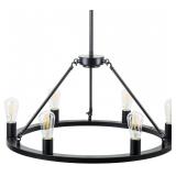 Sonoro Round Chandelier 26" – Black w/Vertical Bulbs - Linea di Liara LL-CH5-26-5BLK PERFECT CHANDELIER FOR YOUR SPACE - The matte black Sonoro Chandelier is great for Entryways, Foyers, Dining Rooms, Family and Living Rooms. Its Modern Farmhouse look works for almost any design style. WORKS FOR YOUR CEILING - Comes with adjustable rods to fit almost any ceiling height, and includes a swivel to accomodate sloped installations. SAFE AND EASY TO INSTALL - UL listed (damp locations) for your safety. Easy to assemble and bulb can be replaced without disassembly. Supported by an American company with Chicago based customer service. In previously opened box, Pls come preview! MSRP: $200 |