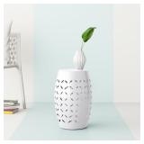 Drum End Table. Color-White. Crafted from iron, this hollow design showcases a solid finish that helps ward off wear from weather, water, and rust. Overall 17.75'' H x 12.25'' W x 12.25'' D