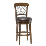 Oconto Swivel Bar Stool. Color-Brown. A charming mix of mediums, this product with cushion features a beautiful distressed medium brown cherry finish, curved back with intricate metal scroll detail in silver finish and dark brown vinyl upholstery. Overall 45.5'' H x 22.38'' W x 20'' D