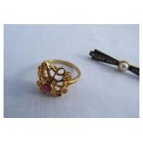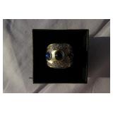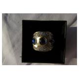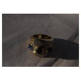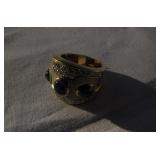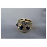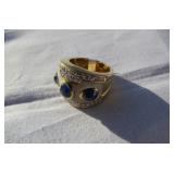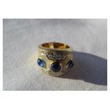 An 18 KT Gold Ring with 3 Burmese Blue Sapphires, Mother of Pearl, and Diamonds - 10 DWT.