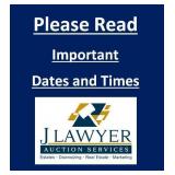 General Terms & Conditions For Personal Property All bidders are required to register and give full identification and establish credit with Auction Company prior to the beginning of the auction. Register early to ensure your approval for bidding by auction time. Note: To supply your credit information by telephone rather than online, please call 304-258-BIDS Auction Company reserves the right to refuse admittance to any person(s). No transfer will be recognized from one bidder/buyer to another. All items, whether personal property or real estate, are sold “As Is, Where Is”, with no warranties or guarantees, express or implied, made by the Seller, Auctioneer or Auction Company. All sales are final. You expressly agree that the use of this Website is at your sole risk, responsibility and obligation. J Lawyer Auctions LLC or its members, employees or providers warrant that this Site will be uninterrupted or error-free; nor do they make any warranty as to the results that may be obtained from the use of this site, or as to the accuracy, completeness, reliability, security, or currency of the Site. By bidding on an item, the bidder shows acceptance of the terms of the auction and acceptance of the item(s) being bid on. No bidder shall retract their bid. Online bidding during a live auction is a fast process, and as a result, there may be no confirmation given – bids will be taken immediately and are irrevocable. A 13% Buyer’s Premium will be added to each item sold. Please refer to the specific terms of each auction on the website information for the buyer’s premium percentage. (Example: A 13% buyer’s premium added to a $100 high bid on an item equals a total purchase price for bidder of $113). Catalog and/or website descriptions of items or properties are for identification purposes only; no representation is made to the correctness, authenticity, age, origin or value of the item(s). Bidders must do the necessary ‘due diligence’ on the item(s) or property prior to the auction and rely solely on their own judgment when bidding. Any and all announcements or changes made by the Auctioneer on the day of the auction supersede any prior marketing materials. If bidder breaches or defaults any portion of the terms & conditions of auction, bidder agrees to pay any and all charges and expenses incurred by Auction Company, including, without limitation, reasonable attorney’s fees, and deficiencies and re-marketing expenses resulting from resale of the item(s) or property. Additional commission shall be due and payable. Please note when bidding, there is an auto-extend feature on this online auction system. If someone bids in the last 2 minutes immediately prior to the end of the auction on that item, the online auction system will automatically extend the bidding time for a 2-4 minute increment (and will continue to do so) until that period(after the original closing time) where no one bids, then the auction on that item will close. This feature will leave the bidding open for any item that has received a bid within the last 2 minutes from the last recorded bid time, even if the ending time has been reached. This feature has been added to eliminate sniping and to make the online bidding process more fair and resemble a 'live' auction. Additional Terms For Personal Property Bidders are responsible for all removal, shipping and damage costs incurred with their items purchased. We ask you bring plenty of help and appropriate equipment for removal of your items. In the event the buyer fails to pay for the entire purchase within the time set forth by the Auction Company, and/or fails to comply with any of the conditions or terms of sale: the seller may retain and/or recover any monies paid as part of damages; items that are not paid for can be resold at public or private sale without further notice; any deficiency resulting from such resale shall be due to the Auction Company by the defaulting buyer together with all charges, fees and expenses, including reasonable attorney fees incurred by such resale and enforcement of the obligation hereunder. Should a dispute arise after the auction, Auction Company records shall be conclusive in all respects. In an unresolved dispute case, the item(s) may be re-offered for auction; however, Auctioneer, in their sole discretion, will analyze the good faith of the parties involved and make the final determination as to the final disposition of the item(s). Auctioneer’s decision is final. |