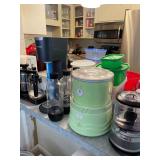 KITCHEN: Salt & Pepper Shakers/Grinders, Mrs. Tea Brewer, Vintage Coffee Maker, Soda Stream Machine & Accessories, Suzanne Somers Ice Cream Machine, KitchenAid Food Chopper, Somersize Grill, Tupperware, Whipped Cream Maker, Kitchen Utensils, Silverware, Keurig Coffee Maker, Keurig Pod Holder, Maxi-Metic Elite Rice & Bean Cooker, West Bend Crock Pot, Welbilt Bread Maker, KitchenAid Electric Mixer, Glassware, Coffee Mugs, Travel Mugs, KitchenAid Food Grinder Attachment, Measuring Cups, Knives, Oven Mitts, Aprons, Cheese Cloth, Rolling Pins, Garlic Press, Cuisanart Food Slicer, Hamilton Beach Blender, Pots, Pans, Skillets, Nepresso Espresso Maker, Mason/Bar Jars, Tons of Bakeware both Glass & Non-Stick (muffin pans, bread pans, casseroles, etc), Colanders, Strainers, Crepe Maker, Cook Books, Vintage Fruit Corer,…