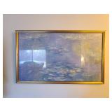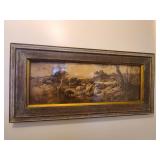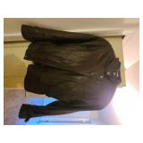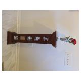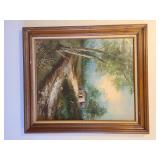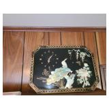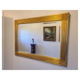 Asian inspired hanging gold mirror, shack in the forest painting, ornate vase, wooden photo display pillar, women’s clothing including blouses blazers jackets coats in coat closet