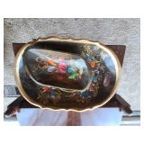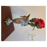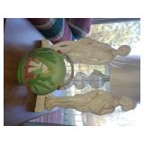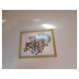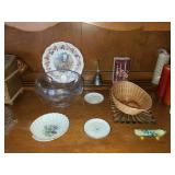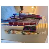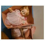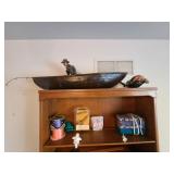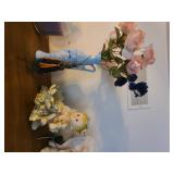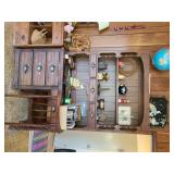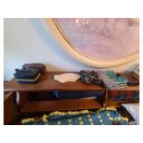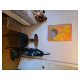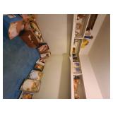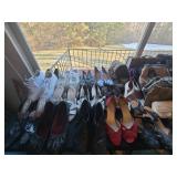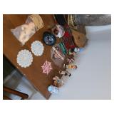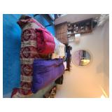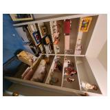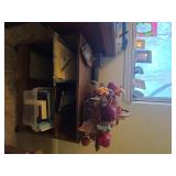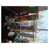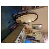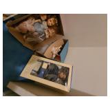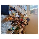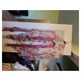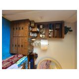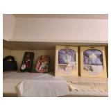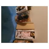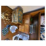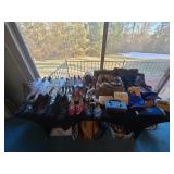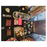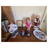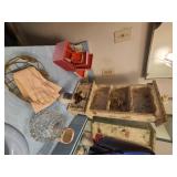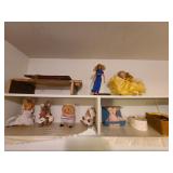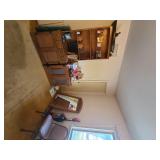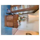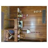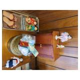 Large round hanging wall mirror with desert scene, headboard with display hutches, wooden chest of drawers with additional shelving, wooden China cabinet, small porcelain figurines such as elephants, dogs, cats, people, angels, tea pot, clock, candle holder, lamp with ceramic people, Madame Alexander McDonald’s happy meal toys tin man, wicked witch of the west, scarecrow, Glenda the good, Dorothy, cowardly lion, women’s dress shoes and heels size 10, women’s boots size 10, women’s casual shoes size 10, purses, clutches, blue velvet chair with wicker detailing, travel bags, beach totes, women’s sandals size 11, kites, women’s clothing including blouses, sweaters, thus, moccasins, stain glass hanging decor, women’s hats, doilies, doll clothes, Small wooden hutch with slanted doors, bony print framed, oval for mirror, portable lap top tray, pink velvet jewelry boxes, Clairol hot rollers, hair care organizer, Revlon hot air brush, con air make up magnifying wall mirror, wrapping paper, shelving paper, vintage stuffed animals, huge collection of vintage dolls including faithful friends by Heidi Art, Madame Alexander blonde blue-eyed baby doll, Paradise Galleries doll, Heidi Madame Alexander doll, bitty baby American girl doll clothing set, doll ironing board and iron, Norman Rockwell character doll Anne