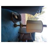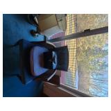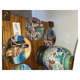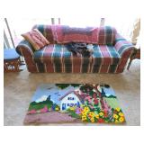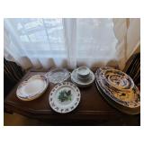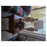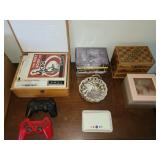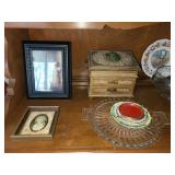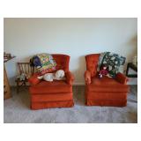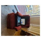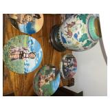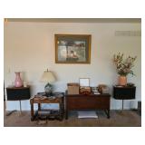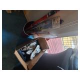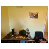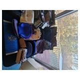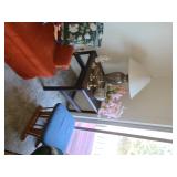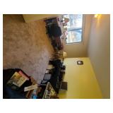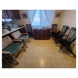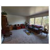 Rust orange rocking arm chair, small end table, brass lamp, Mauve velvet chair with wicker arms, Bose speakers, MJ Hummel plates, Asian inspired porcelain lamp, small child garden painting, wireless PlayStation controllers, PC games, Xbox games, Xbox 360 games, PS3 games, Things remembered trinket box, large salmon colored ceramic face with fake flowers, glass candies, emerald green, navy blue, maroon, and cream plaid sofa, Brass candleholders, knit throws, porcelain baby dolls, British and Scottish porcelain dolls, ornate jewelry box, glass and gold daisy bowl set, decorative fans