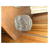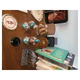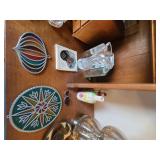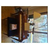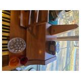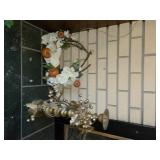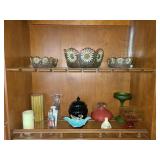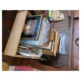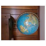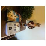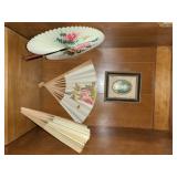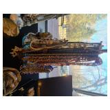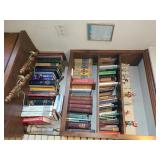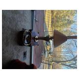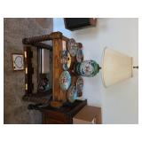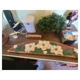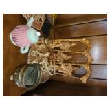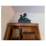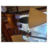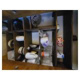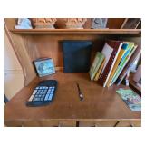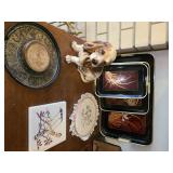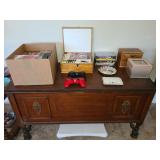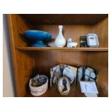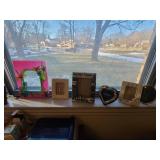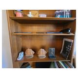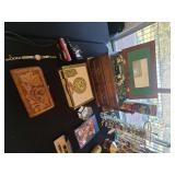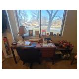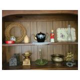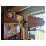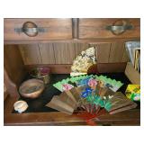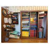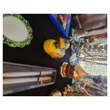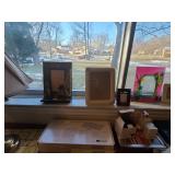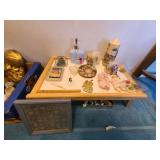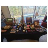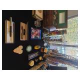 Asian inspired clock, globe, sleighbells, picture frames, Asian inspired decorative fans, Wilson All-Star baseball Fredlund edition, brass ship, black and gold teapot, ornate lamp, wooden secretary‘s desk, Sears Kenmore sewing machine, small wooden hutch with drawers, ceramic dog, bookends, asian inspired nesting serving trays, large National Geographic collection, large classic book collection, ceramic docks, candles, brass fire set, large candle pillar, abstract forest painting of birch trees, small live plants, clown figurines, porcelain baby bride doll, small sailboat Picture, ceramic lamp, mead astronomical telescope D equals 50 mm F equals 600 mm with stand, acro Sonic piano, brass desk lamp, ornate jewelry box vase, glass figurines