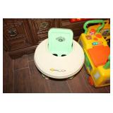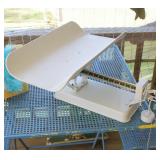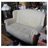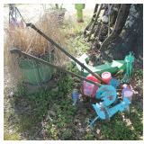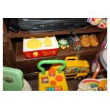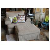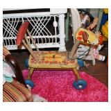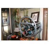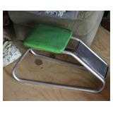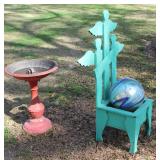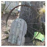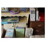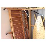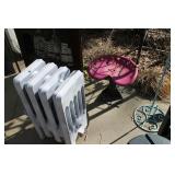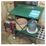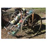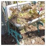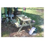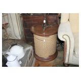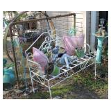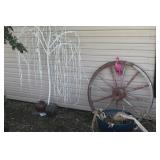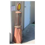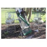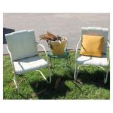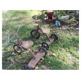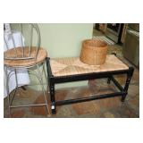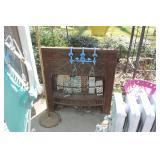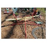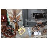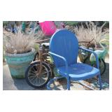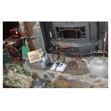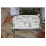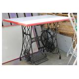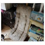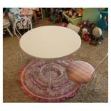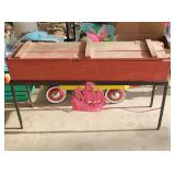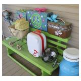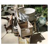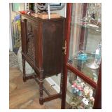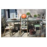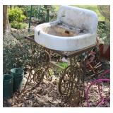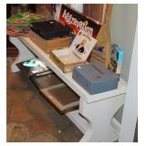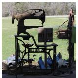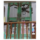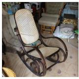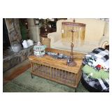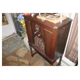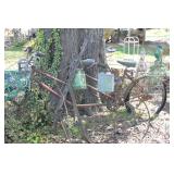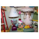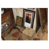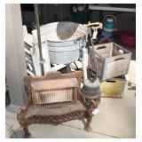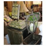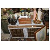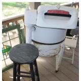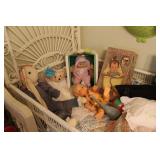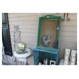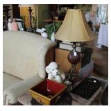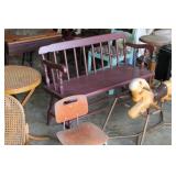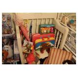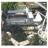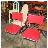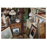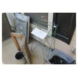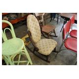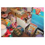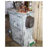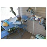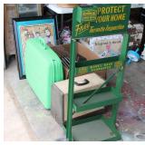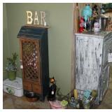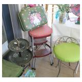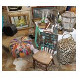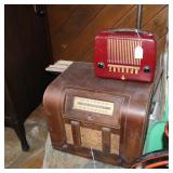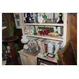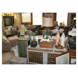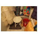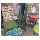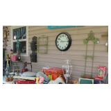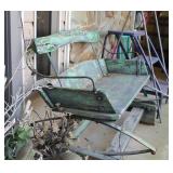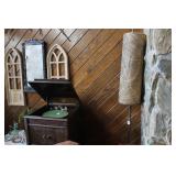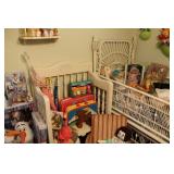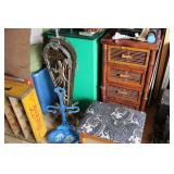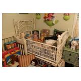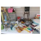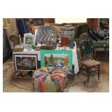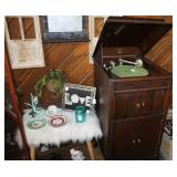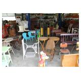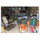 FURNITURE: Over Stuffed Chair with Ottoman, Odd Ottomans, Love Seat, Curio Cabinets, Shabby Chic Vanity, Chairs, & End Tables, Set of 4 Iron Bar Stools, Vintage Trunks, Wicker Child's Furniture, Wicker Doll Furniture, Outdoor Iron & Retro Furniture, Rattan Furniture, Set of 50's Red Metal Chairs, Dozens of Odd Wooden Chairs, Antique Child's Desk, Floor Lamps, Shabby Chic Secretary, Beautiful White Wicker Baby Bed (Very Ornate.), Antique Columbia Victrola (It works.), Shabby Chic Stereo-Phonic Console (Decorative Only), Antique Westinghouse Radio, Antique One of a Kind Sawblade Table, with Hand Pump, Antique Furniture, etc.