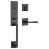 Kwikset Vancouver Low Profile Front Lock Handleset with Microban Including Slim Modern Halifax Door Lever Handle Featuring SmartKey Security, Iron Black