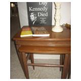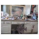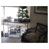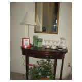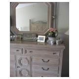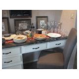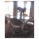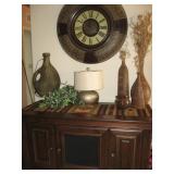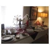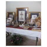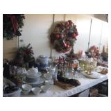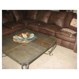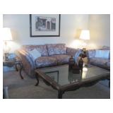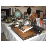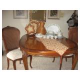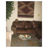 Dark brown leather sectional with inter-changeable cushions: Beautiful scroll design dining room table with three leaves and four seat upholstered chairs; Queen headboard/footboard, dresser with mirror and two nightstands; Large coffee table with two matching side tables; Two upholstered love seats; Curved dresser with wrought iron accent and matching nightstand; Lighted round curio cabinet; Large square tile top coffee table, nice golf clubs, electronics; Bedding; Artificial plants; Weber, grill; Patio table with four chairs; Glass top dinette set with four chairs; household items and decor throughout |