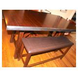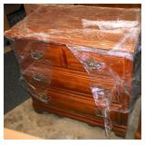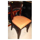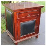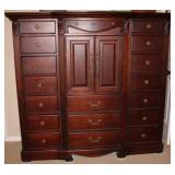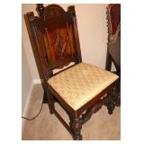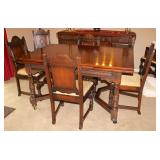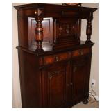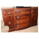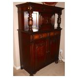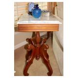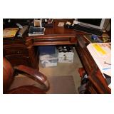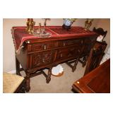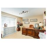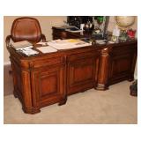 Leather-top “L-shaped” executive desk-very nice; leather office chair; painted ornate French serpentine-front, marble-top chest-very nice; Victorian carved rosewood balloon-back parlor chair; large dark mahogany armoire chest-very nice; upholstered mid-century armchair; 1940’s burl mahogany buffet; Victorian Eastlake marble-top walnut parlor table; Victorian Eastlake marble-top walnut fern stand; excellent, signed 1920’s Mediterranean-style, heavily carved dining room set-linen press, refractory table & (6) chairs, buffet (has old appraisal of $15,000.00); blue leather armchair & ottoman-nice; unusual heavy brass end table w/ alabaster top; trestle farm dining table w/ (2) highback stools & bench; 3-piece modular wine cabinet-nice; large Ethan Allen dark maple bedroom suite set-small linen press, bed, chest of drawers, vanity table, dresser w/ mirror, lingerie chest, (2) nightstands; mid-century end table; suede ottoman w/ built-in storage; unusual leather occasional chair; antique pie safe; assorted rugs; assorted end tables; several floor lamps; etc.