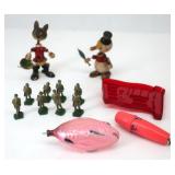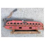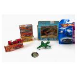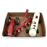 43 LOT OF 6 DIECAST CARS AND PLASTIC FARM IMPLEMENT