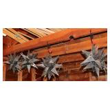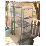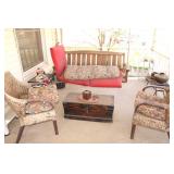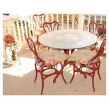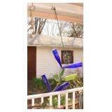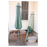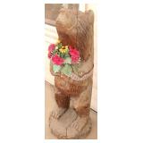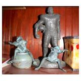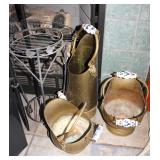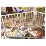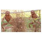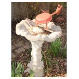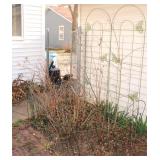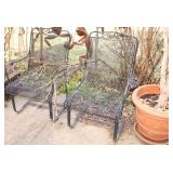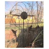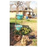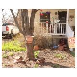 Very nice ice cream parlor metal table & chairs set w/ glass top; many iron plant stands; chainsaw art carved bear statue; wooden carpenter’s trunks; many planters; porch swing; ornate concrete birdbath; much metal yard art; iron shepherd’s hooks; glass bottle trees; cast iron well pump; iron fencing & trellises; (2) large patio umbrellas & stands; large galvanized metal washtub; huge set of vintage Mexican metal frog musicians; (2) Woodard wrought-iron chairs & chaise lounge; large pots; Mexican terra-cotta chiminea; (2) Weber BBQ grills; assorted wrought iron patio furniture; (2) portable green houses; & much more!