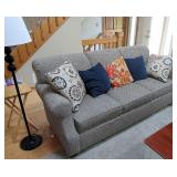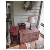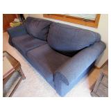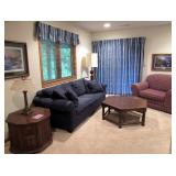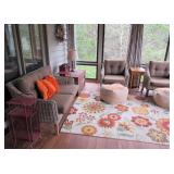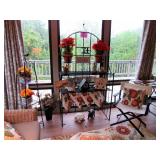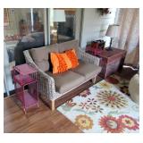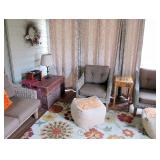 SEATING FURNITURE: SOFAS, SLEEPER SOFA, CHAIRS. 3 SEASON ROOM FURNITURE: WICKER LOVESEAT & CHAIRS, WROUGHT IRON ETAGERE AND WROUGHT IRON TALL SHELVING/BAKERS RACK FOR FLOWERS, LARGE WICKER TRUNK, 2) ZULILLY RED METAL SIDE TABLES, PIER 1 FLORAL HIGH QUALITY WOOL AREA RUG. BLUE FLEXSTEEL SLEEPHAVEN SOFA SLEEPER LA-Z-BOY 3 CUSHION SOFA - NICE! WHITE WICKER ARMCHAIR AND ROUND WICKER TABLE RECLINER, ROCKING GLIDER CHAIR, LARGE 1.5 WIDE ARMCHAIR ADDITIONAL CHAIRS, PLUS MUCH MORE