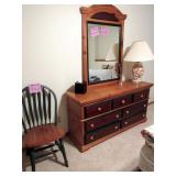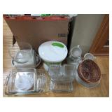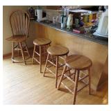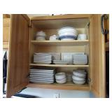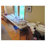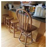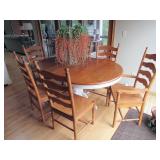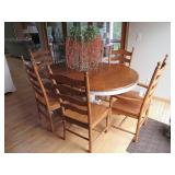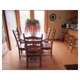 KITCHEN ~ DINING: DINING TABLE SET W/6 OAK CHAIRS, OAK BAR STOOLS PINE DYI STOOLS SETS OF DISHES AND KITCHENWARE