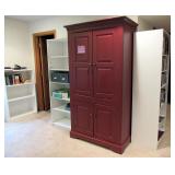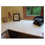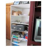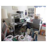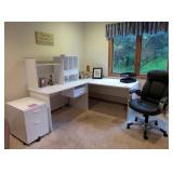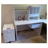 OFFICE FURNITURE: WHITE COMPUTER DESK WITH HUTCH TOP NICE QUALITY WHITE LARGE DESK WITH LAMINATE TOP, PERFECT FOR CRAFTING WORK TABLE DRAWER PEDESTAL ON WHEELS 3 WHITE BOOKCASES ASSORTED SIZES BLACK OFFICE CHAIR 2) WOOD LATERAL FILE CABINETS 2) VERTICAL CABINETS IN 2 WOOD COLORS
