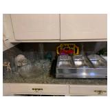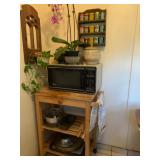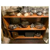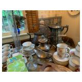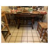 KITCHEN: Drop leaf dining room table and chairs, rolling carts, dishes, pot racks, cast iron, fridge, silver plate,