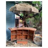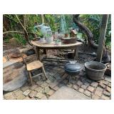 OUTDOOR: Baseball bats, fishing poles, fountain, patio table with umbrella and chairs, Tiki Bar with umbrella, teak furniture, bicycle, yard décor, old Victorian window, wood, old fence, planters and plants, gardening tools, lawn mower, chiminea,