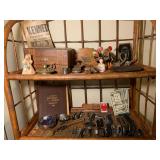 COLLECTIBLES: Jewelry, many true antique items, book of stamps, bell collection, knife collection, tobacco pipes and accessories, old newspapers, antique butter churner, and more!