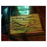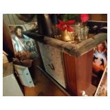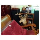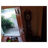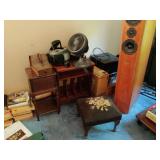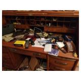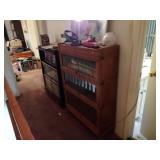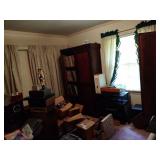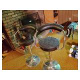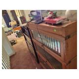 MID CENTURY MODERN FURNISHINGS INCLUDING TWO CHROME AND LEATHER BAR STOOLS. TWO PIECE HAND PAINTED ORIENTAL ROOM DIVIDERS ONE MCM TUFTED LEATHER BAR. PAIR OF RARE SOLID OAK FILING CABINETS. THREE BARRISTER BOOKCASES. TWO ROLL TOP DESKS SETH THOMAS “TEMPUS FUGIT” GRAND MOTHER CLOCK. SETH THOMAS MANTEL CLOCK.