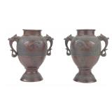- 1009 PAIR OF VTG CHINESE BRONZE DRAGON HANDLE URNS