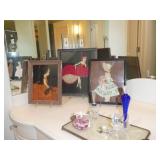Vintage Venetian glass mirrors Pair of red lacquer lamps Vintage crystal lamp Carved marble goddess sculpture Pair of heavy brass barley twist candlesticks Collection of 1930’s “Ribbon Ladies” Collection of black and white silhouettes Vintage onyx pottery collection 2 pairs of vintage crystal candelabras Hand knotted wool red and blue Oriental rug 10’x13’ Needle point floral rug 7.5’x 9’ Heavy brass candlestick lamp with brass shade Pair of red painted lacquer candlestick lamps McCoy and Brush McCoy pottery jardinieres Chinese porcelain tub Johnathan Adler ceramic owls Majolica tiles Pewabic candlesticks Brown ginger jar lamp Pair of heavy silverplated candelabras Antique porcelain serving pieces Wine glasses Silverplated serveware Mackenzie Childs Courtly Check bowl Antique oval silvered mirror Hand knotted wool Oriental rug red black and brown 10’x13’ White ginger jar lamp Picture frames Vintage porcelain lace dress figurines Pair of black bamboo lamps Vintage beveled mirrors MISCELLANEOUS