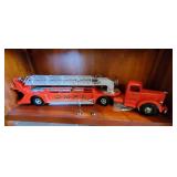Cars and Trucks: antique Lumber truck and SMFD fire truck, Texaco Truck, NYLINT GMA 18-Wheeler and more NYLINT 18-wheelers, Coca-Cola truck, Hess trucks, James S. Beam model car decanters, NASA United States Enterprise